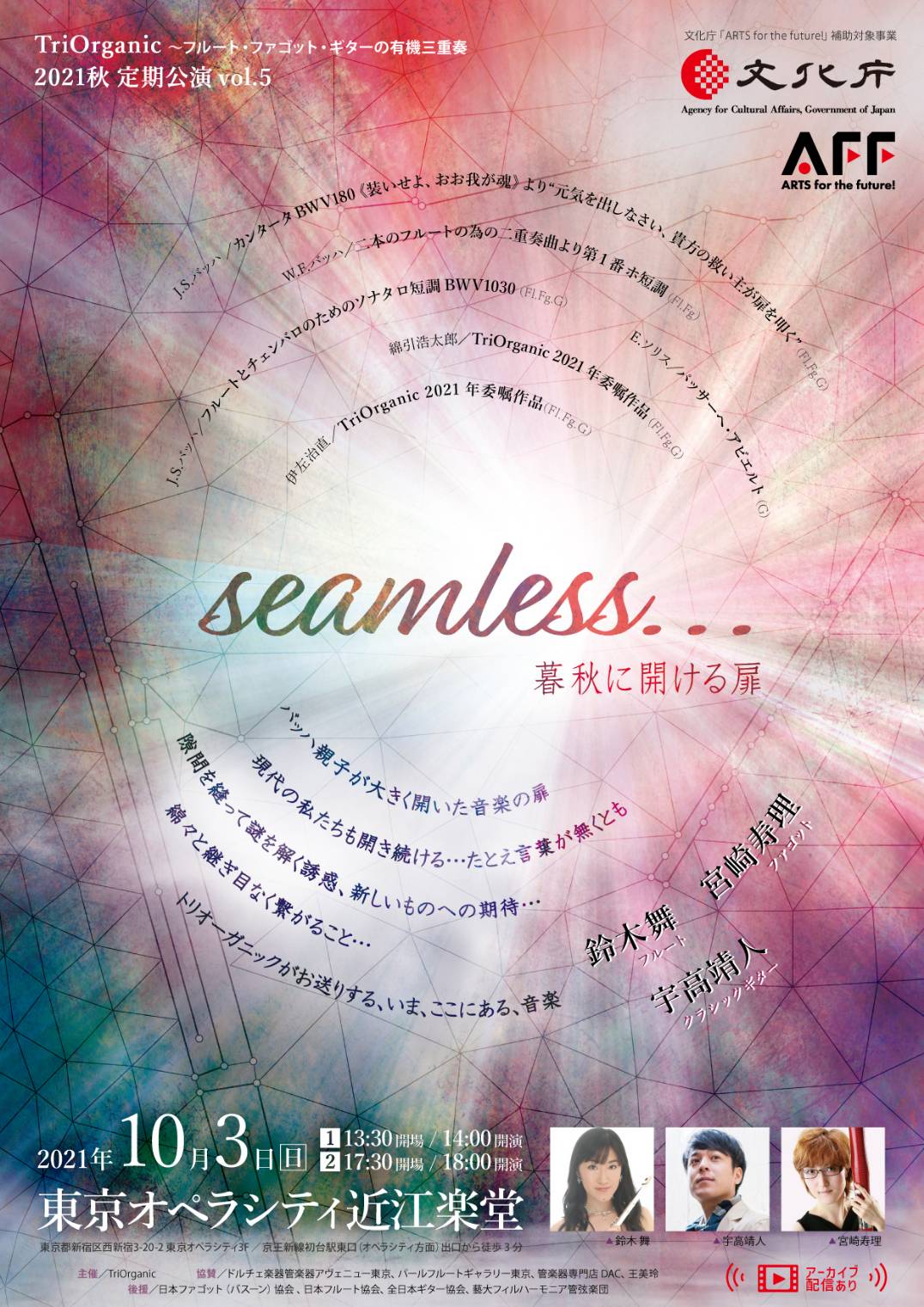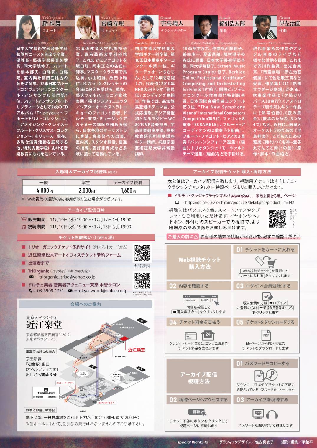 10月3日の演奏会で新曲を発表します。 未選択 2021年09月03日 TriOrganic~フルート・ファゴット・ギターの有機三重奏 2021【 秋の近江楽堂定期公演 vol.5 ~seamless~暮秋に開ける扉 】日時: 2021年10月3日(日) 14時~と 18時~の2回公演演奏: TriOrganic ≪ 鈴木舞(フルート)・宮崎寿理(ファゴット)・宇高靖人(ギター) ≫場所: 東京オペラシティ3階 近江楽堂演目: バッハのフルートソナタロ短調。Triorganic委嘱作品として伊左治直先生の新曲、綿引浩太郎の新曲『WORLD TRAVEL』を初演予定です。 PR